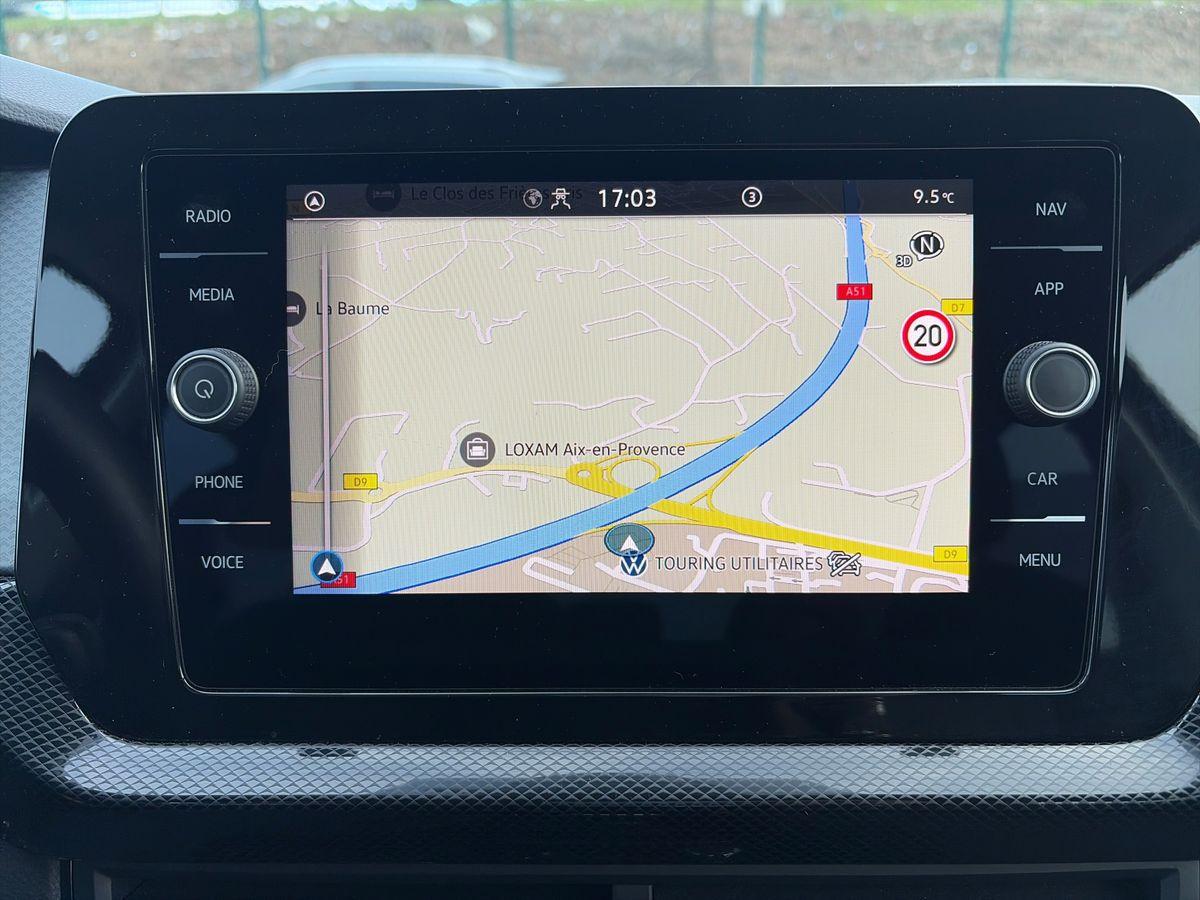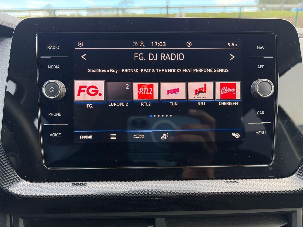 Système Navigation & Infotainment "Discover Media" avec "Services de streaming et radio via Internet" via carte eSIM intégrée: Radionavigation 6 HP AV/AR (4 x 20 W) avec: Ecran couleur tactile 8 haute résol. (800x480), Double tuner FM, affichage de la plage de lecture, du logo de la station à l'écoute, lecture des formats audio MP3, port USB-C compatible Apple®, affichage de la carte en 2D, affichage des logos des Points d'intéret, des limit. de vitesse, des zones de danger, interface Bluetooth® mains-libres pour téléphone portable, Préparation pour "VW Connect" et "VW Connect Plus"